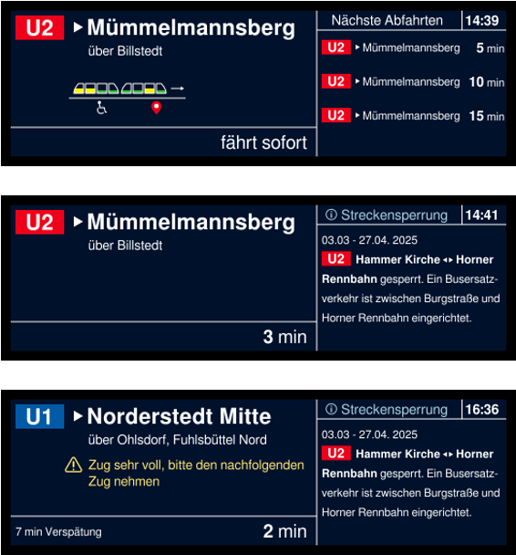 Jeder kennt sie: Die Anzeigen im U-Bahnhof, welche anzeigen wann die Bahn kommt und wo diese hinfährt. Doch nun hat die HOCHBAHN ein neues Modell vorgestellt und am U-Bahnhof Horner Rennbahn eingebaut: Als vor circa 5 Wochen die U2 zwischen Legienstraße und Hammer Kirche/Burgstraße gesperrt war konnte man an Fotos des Bahnhofs Horner Rennbahn die neuen Anzeigen schon sehen, als sie die alten Anzeigen ersetzt haben. Nun ist der Betrieb zwischen Horner Rennbahn und Legienstraße wieder aufgebaut und die neuen Anzeigen sind in Aktion getreten. Sie ähneln den neuen Anzeigen der S-Bahn: bunte Linienlogos, blauer Hintergrund und weiße Schrift und sehen im Vergleich zu den alten Anzeigen der HOCHBAHN, welche ab 1996 eingebaut wurden, ziemlich anders aus. Bis 2027 sollen alle U-Bahnhöfe die neuen Anzeigen erhalten und die alten Anzeigen sollen aus dem Hamburger U-Bahnnetz verschwinden. Ob dieser Zeitplan allerdings eingehalten werden kann, ist eine andere Frage, denn bei der S-Bahn, welche ihre Anzeigen bereits seit 2021 durch neue ersetzt hat, wollte alle Bahnhöfe bis 2023 mit den neuen Anzeigen ausstatten. Heute, in 2025, ist noch jeder zehnte Bahnhof im Hamburger S-Bahngleichstromnetz mit den alten LCD-Anzeigen ausgestattet. Doch zurück zur U-Bahn: Die neuen Anzeigen wurden von der Firma Funkwerk bereitgestellt. Die flächendeckende Ausbreitung der Displays soll Anfang 2026 starten. Der HOCHBAHN-Technikvorstand Jens-Günter Lang erklärte beim Pressetermin vor 6 Wochen, dass die Anzeigen, bis jeder Bahnhof im Hamburger U-Bahnnetz die neuen Anzeigen erhalten hat, nichts Neues können, das heißt, dass man bis 2027 sozusagen die abwärtskompitable Version zu sehen bekommt. Dies sei der IT im Hintergrund geschuldet. Was es allerdings für neue Funktionen geben wird, wurde noch nicht bekannt gegeben. Und sollte es doch bekannt gegeben worden sein, dann habe ich bei meiner Recherche dazu leider nichts gefunden.
